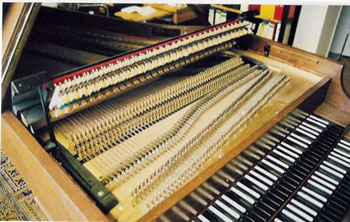 Das Fundament gebende 16-Fuß-Register, ein Gussrahmen, Lederbekielung, große Klaviermanualmensuren, große Wirbel, umsponnene Basssaiten, die flügelmäßige, nach unten offene Rastenbauweise, eine dem englischen Tafelklavierbau entlehnte Gliederdämpfung für die oben liegenden 8'- und 16'-Register und eine dem Orgelbau entlehnte Pedalschaltung für die Register sind einige besondere Merkmale dieses wuchtigen, in Eiche gearbeiteten Instrumentes. "Modern" wirkt(e) etwa die Kombination [neudeutsch: "Material-Mix"] von schwarzem Plastik (Bakelit?) auf den Untertasten mit Elfenbein als Obertastenbelag.