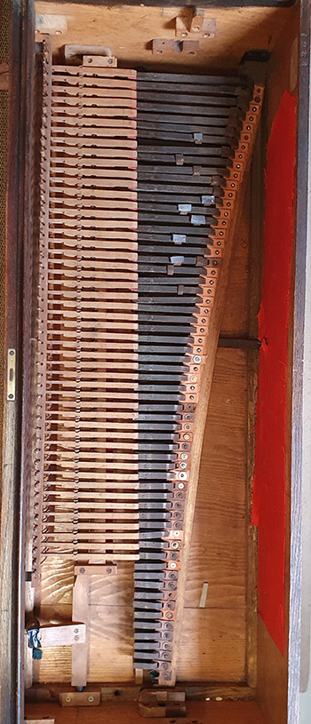 Restaurierung: Grundlegende Restaurierung durch Jan Großbach (Frankfurt-Höchst) im Mai und Juni 2023; dabei Identifikation von Machell als Hersteller und Dyson & Sons als Händler/Vermieter. Beseitigung der nicht-originalen Teile und Ersatz durch dem Original entsprechende Teile. Nachbau der verloren gegangenen Stimmgabel im Diskant.