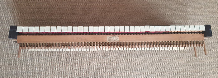- Untertasten: 137 mm sichtbare Länge, 49 mm vordere Untertasten-Länge; Belag: Kunststoff